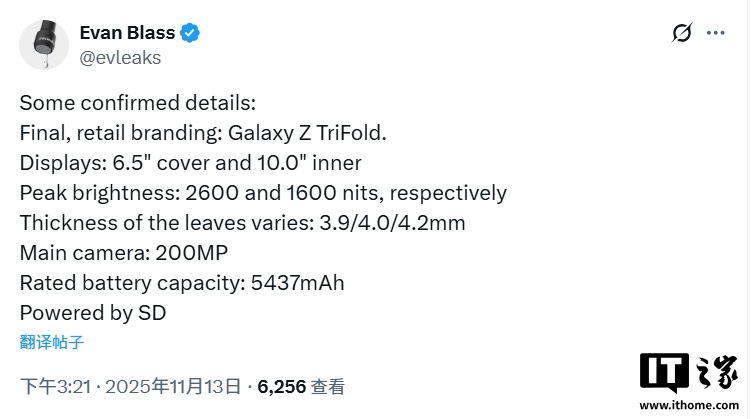 IT之家 11 月 13 日消息,三星首款三折折叠智能手机 Galaxy Z TriFold 预计将于 12 月 5 日正式发布,最新泄露消息披露了该机多项核心规格,包括超大尺寸显示屏、2 亿像素主摄以及旗舰级处理器等关键信息。