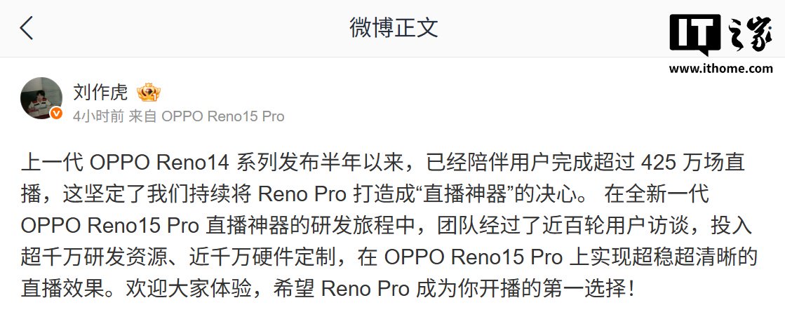 IT之家 11 月 13 日消息,OPPO 首席产品官兼一加创始人刘作虎今天在微博发文称,上一代 Reno 14 系列发布半年以来,已陪伴用户完成超 425 万场直播,坚定他们继续将 Reno Pro 手机打造成“直播神器”的决心。