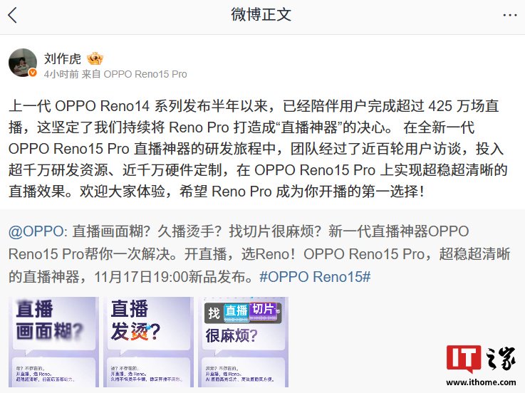 OPPO 首席产品官、一加创始人刘作虎今日发文预热新机,并透露上一代 Reno14 系列发布半年以来,已完成超过 425 万场直播。全新一代 Reno15 Pro 研发中,团队经过了近百轮用户访谈,投入超千万研发资源、近千万硬件定制,在新机上实现超稳超清晰的直播效果。