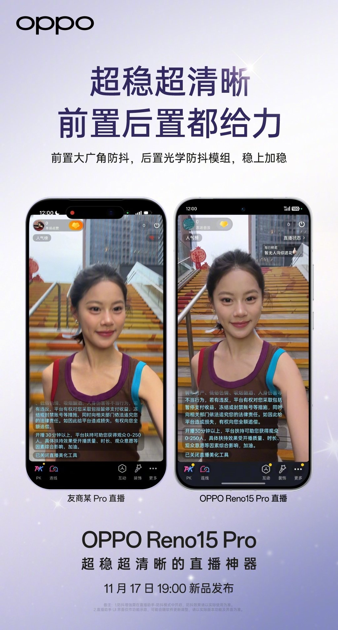 IT之家 11 月 13 日消息,OPPO Reno15 系列手机已官宣 11 月 17 日 19:00 新品发布,根据官方预热,Reno15 Pro 定位“直播神器”,主打“超稳超清晰”特性。