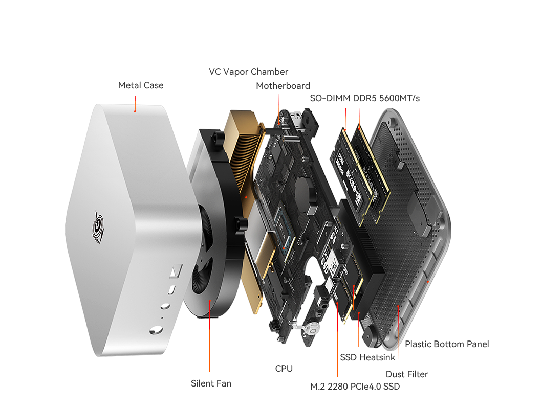 SER9 Max 三维 135×135×44.7 (mm),拥有金属机身外壳,具备由均热板、静音风扇模组、固态硬盘散热片构成的 MSC2.0 散热系统,性能释放可达 65W、运行噪声 32dB。