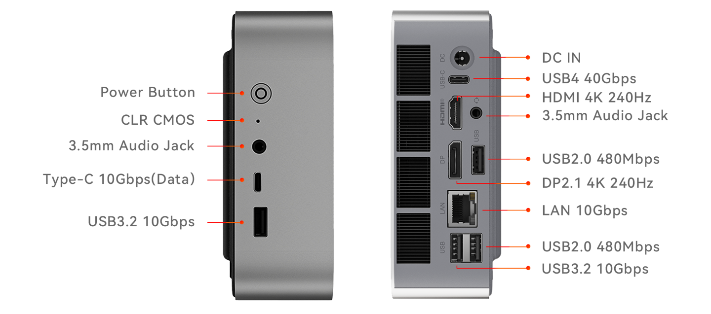 外部 I/O 方面,这款迷你主机正面提供 1 个 USB-C 10Gbps、1 个 USB-A 10Gbps、1 个音频插孔;反面提供 1 个 USB-C 40Gbps、1 个 USB-A 10Gbps、2 个 USB-A 480Mbps、1 个 HDMI 2.1 FRL、1 个 DisplayPort 2.1、1 个 10GbE RJ45、1 个音频插孔。