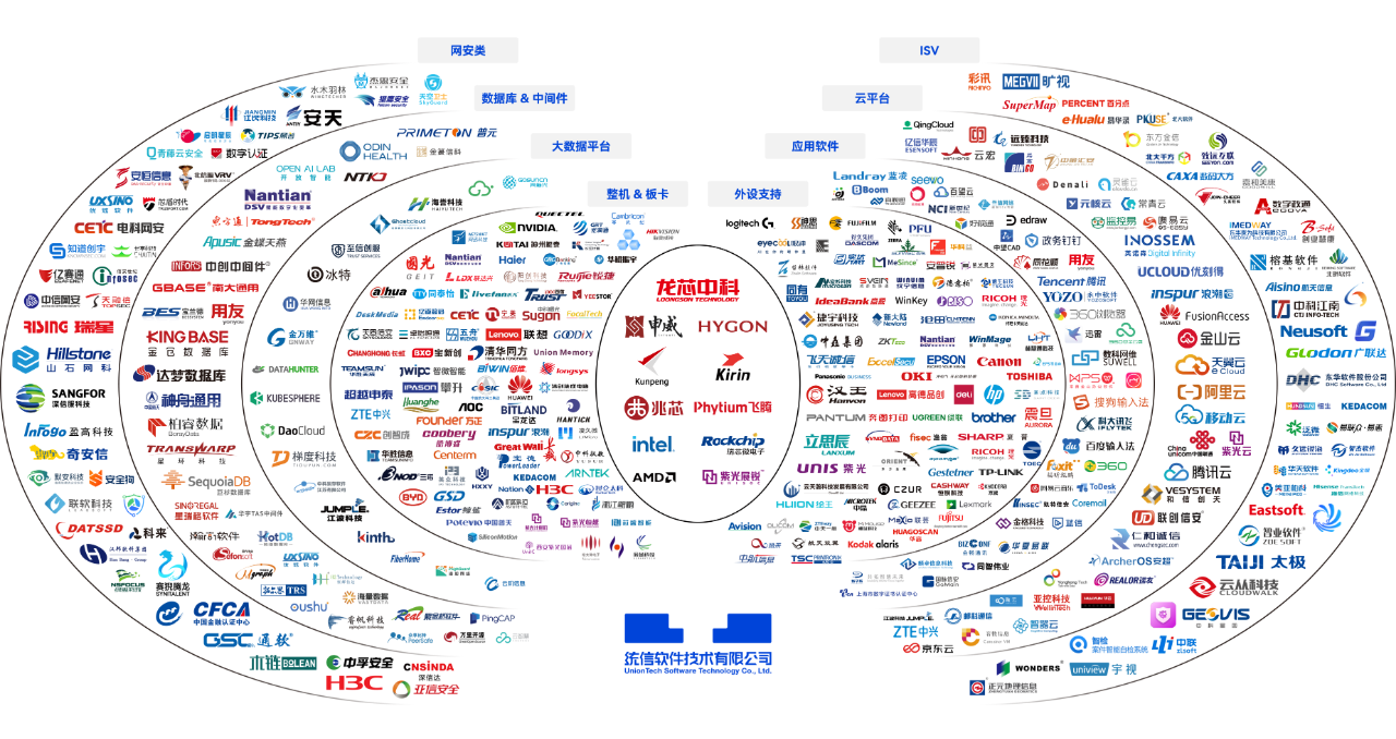 统信软件与龙芯、飞腾、海光、兆芯、申威及 Intel 等主流芯片厂商建立联合生态实验室,与鲲鹏计算达成深度合作,支持重点整机厂商主力机型 100+ 款,实现所有整机机型 100% 兼容性适配及互认证,完全符合量产出货标准。