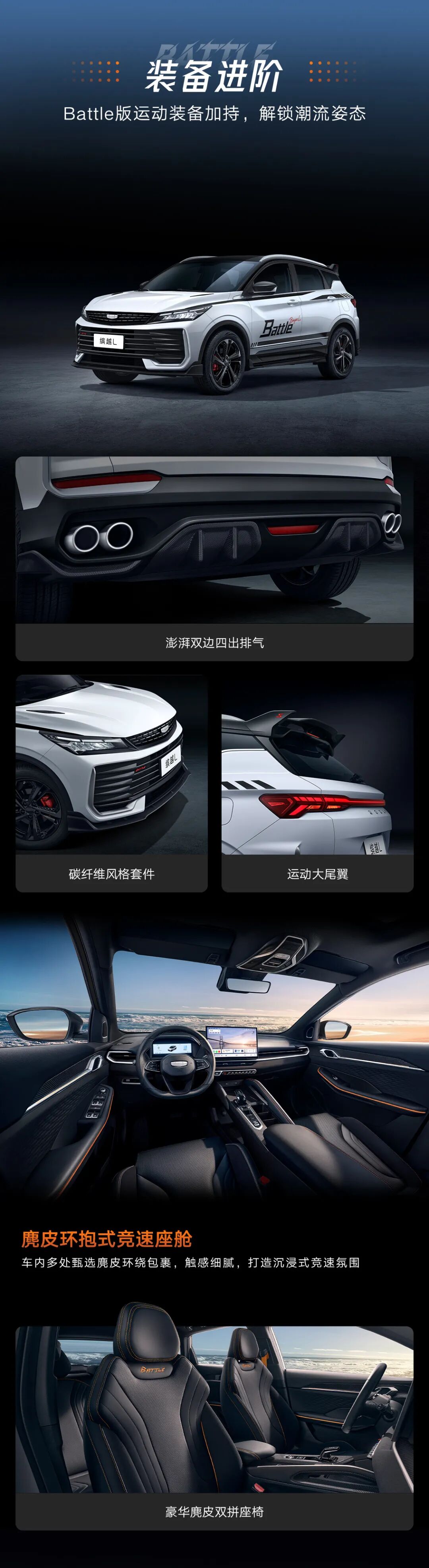 新车外观增加碳纤维风格运动套件,配有专属的 Battle 标识、大尾翼和红色卡钳,相比标准版增强视觉冲击。其长宽高分别为 4380/1800/1609mm,轴距为 2600mm。