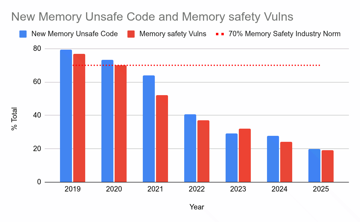 官方数据显示,2025 年 Android 内存安全类漏洞占比首次降至全部漏洞的 20% 以下。