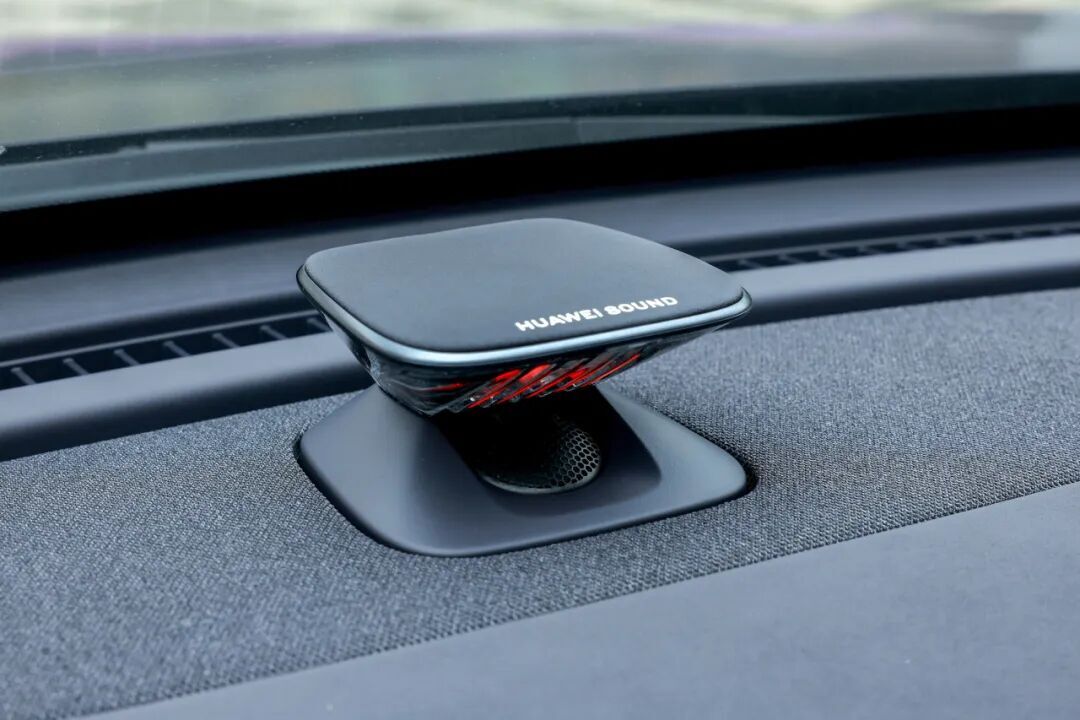 该车配有 50W 风冷无线快充、AI 助手、氛围灯,保留关键的实体键,还有 HUAWEI SOUND 音响,配有 17 个高保真扬声器。