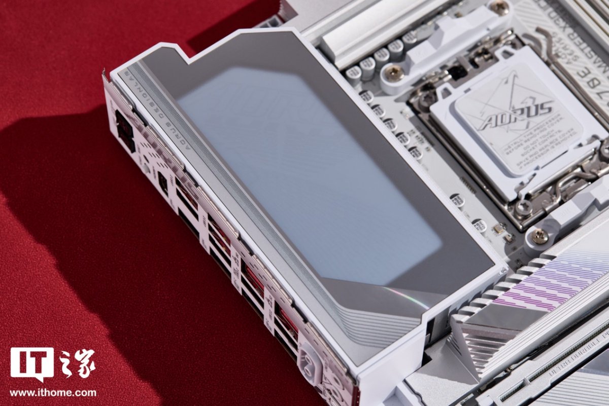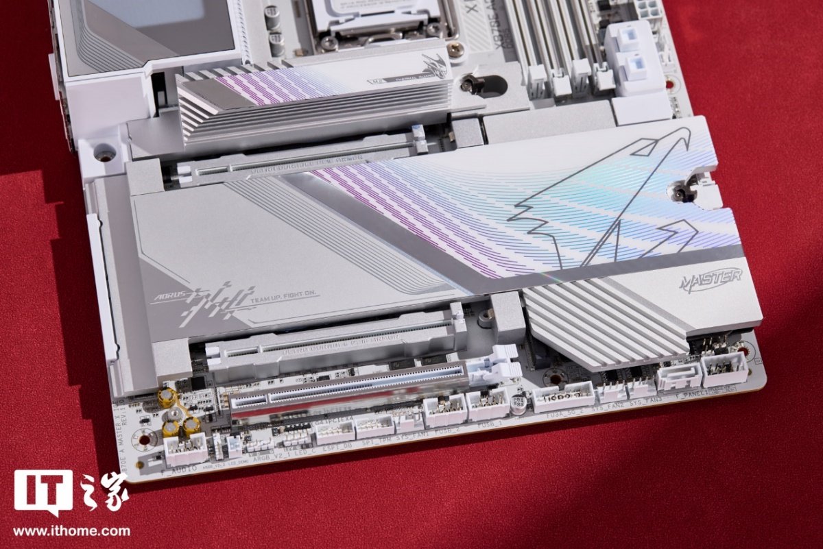技嘉超级冰雕 X870E X3D 主板采用纯白 PCB 和银色金属散热装甲,几乎所有 PCB 上的元器件都做了白色喷涂,包括内存和 PCIe 插槽、CPU 扣具座、接口外壳以及数显灯和按键,视觉一体感极强,风格简约大气。