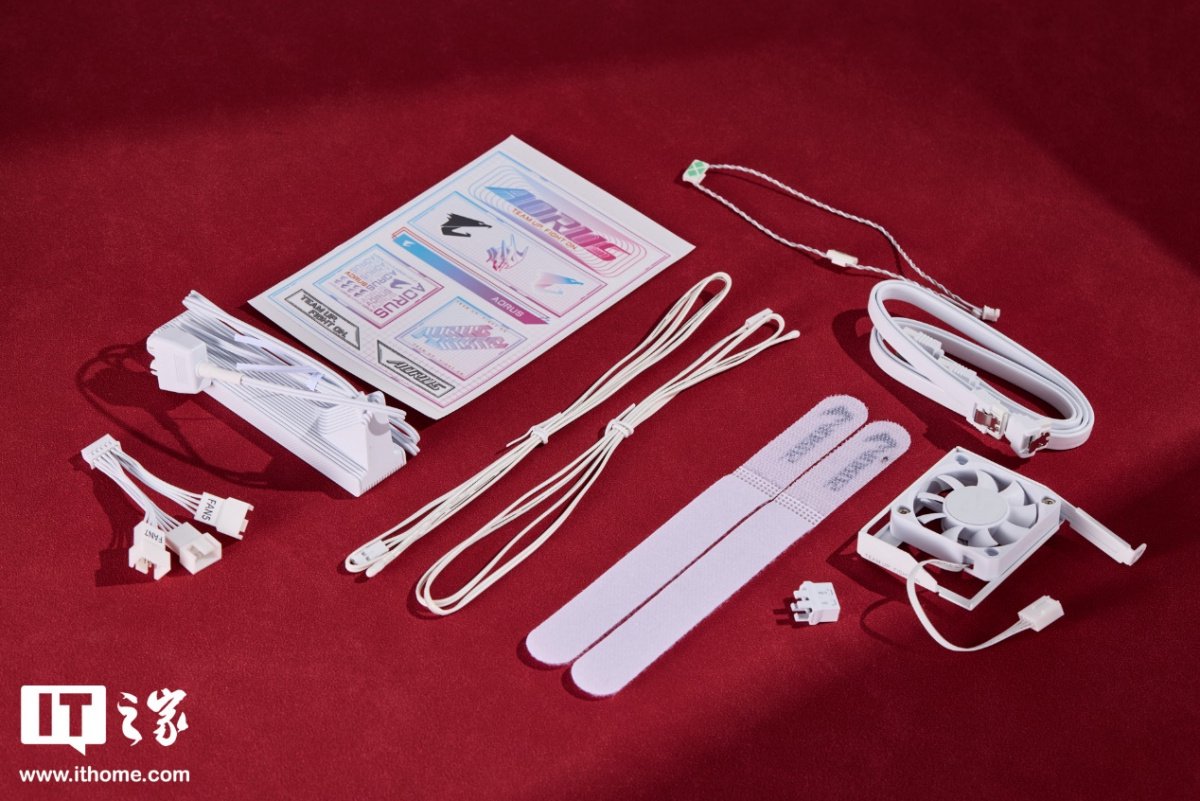 配件部分相当丰富,包括:1 个白色快易拆设计的 Wi-Fi7 天线;12pin 一分三风扇转接线;1 张贴纸徽章;2 根 SATA 数据线;1 条噪音检测线;1 个前置跳线集线器;2 条扎带;1 个内存风扇。