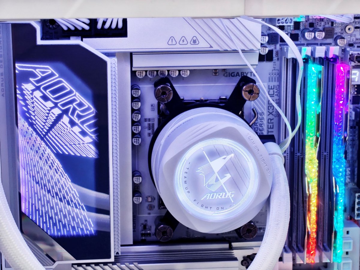 主板背面也覆盖了超大面积的一体式铝合金背板,表面还印有新一代电竞雕图案以及 AORUS Logo。