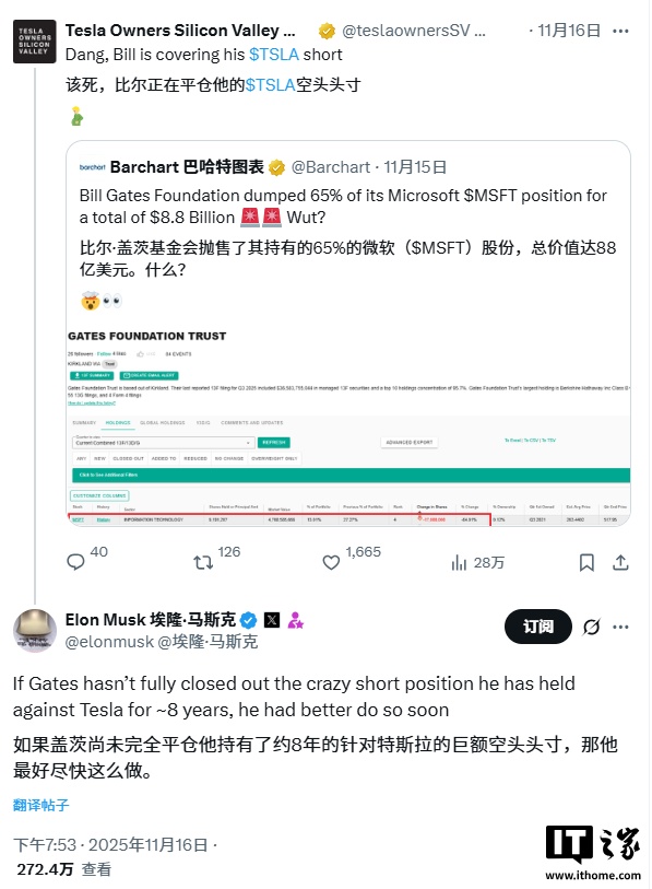 IT之家 11 月 17 日消息,特斯拉首席执行官埃隆・马斯克向比尔・盖茨发出“最后通牒”,要求其尽快平仓针对特斯拉的空头头寸,盖茨数年前曾亲口向马斯克本人确认持有该头寸。