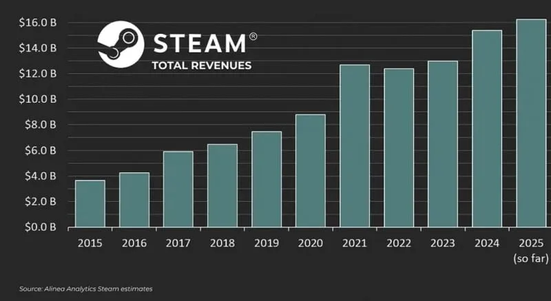 若上述估算准确,2025 年将超越 2024 年,成为 Steam 平台历史上营收最高的年份。Alinea Analytics 指出,Steam 2025 年迄今的收入已比 2024 年全年总收入高出约 5.7%;随着年末促销活动(如冬季特卖)临近,这一差距有望进一步扩大。