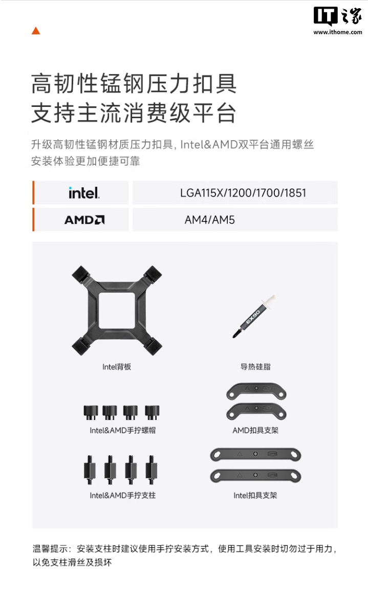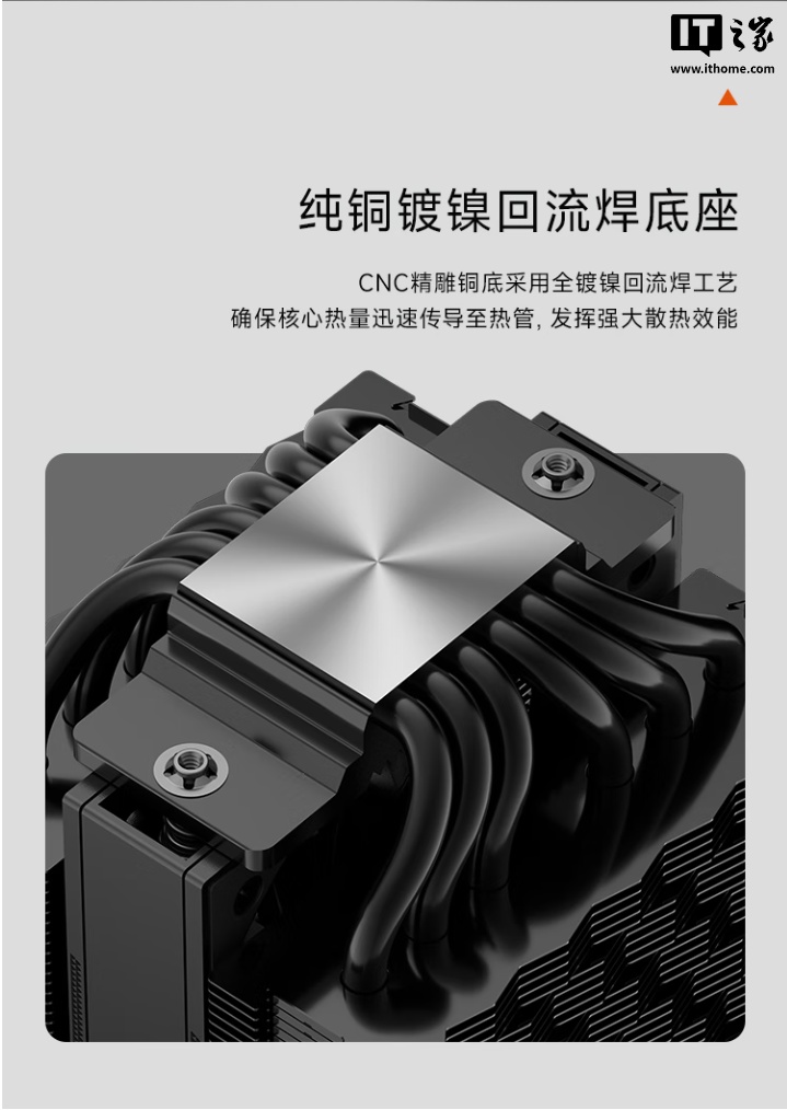 此外,这款散热器还拥有纯铜镀镍回流焊底座,采用 CNC 工艺精雕,可确保 CPU 核心热量迅速传导至热管,兼容英特尔 LGA 115X/1200/1700/1851 插槽和 AMD AM4/AM5 插槽,双平台均通用一套螺丝,使安装体验更加便捷。