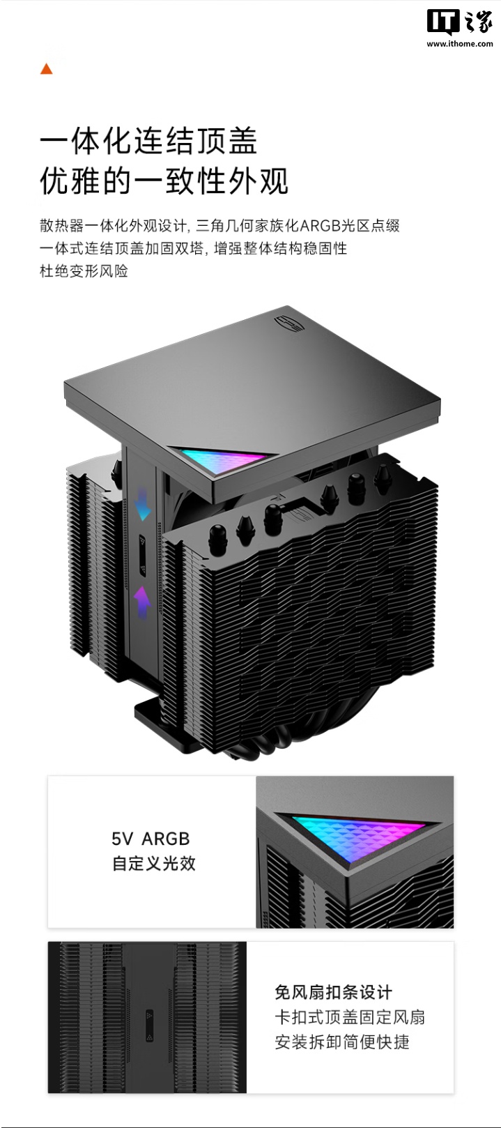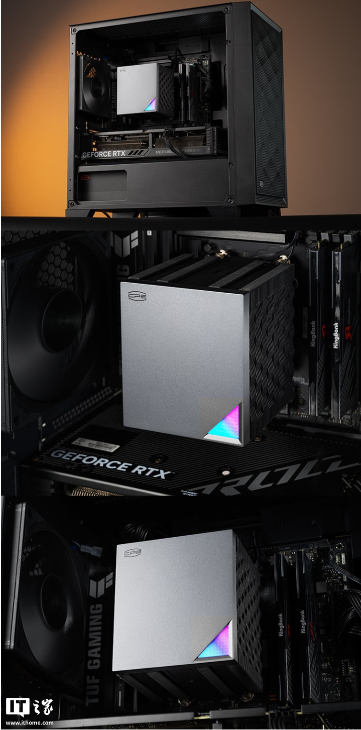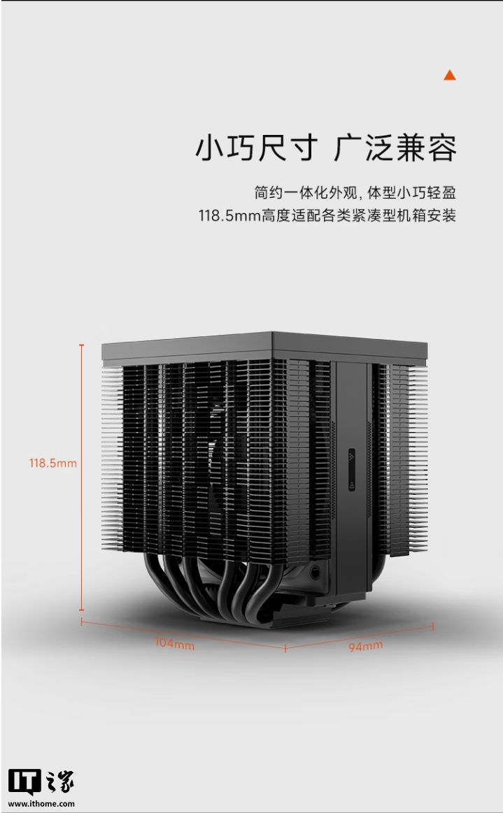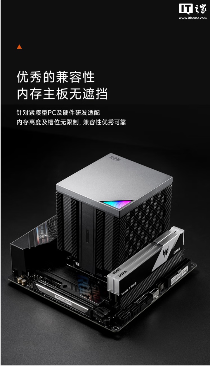 据介绍,这款散热器采用简约一体化外观,高度为 118.5mm,兼容各种小型机箱,可适配各种高度及槽位的内存,确保兼容性,顶部拥有家族化 ARGB 光区点缀,采用双塔式架构,内置一体式连接顶盖,增强整体结构稳固性。
