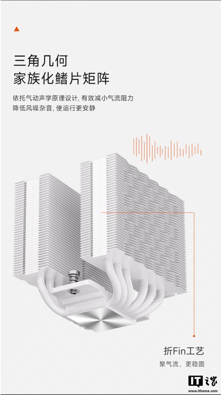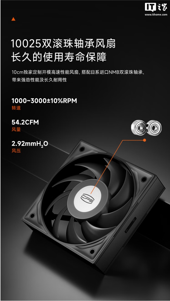 硬件方面,这款散热器拥有自研高功耗热管,规格为 6mm*6pcs,可兼容水平或垂直安装,内置三角几何鳍片矩阵,可有效减小气流阻力,降低风噪杂音,自带 10025 双滚珠轴承风扇,配备日系进口 NMB 双滚珠轴承,转速范围可达 1000-3000±10% RPM,采用 10cm 独家定制设计。