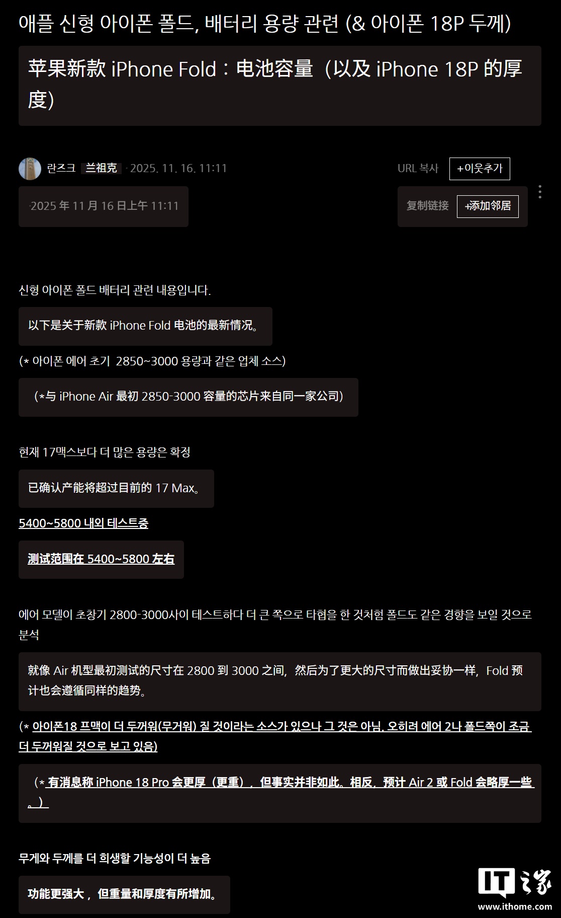 IT之家 11 月 18 日消息,消息源 Yeux1122 于 11 月 16 日发布博文,报道称苹果正为其首款折叠手机 iPhone Fold 测试电池,容量在 5400mAh 到 5800mAh 之间。