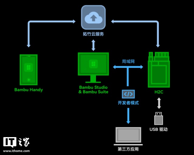支持云端连接的同时,H2C 也支持本地局域网模式和物理连接操作。用户可以在不连接因特网的情况下控制打印机、发送切片、更新固件。对于喜欢捣鼓的用户,开发者模式也让用户可用第三方配件和软件通过 MQTT 连接和操控打印机。