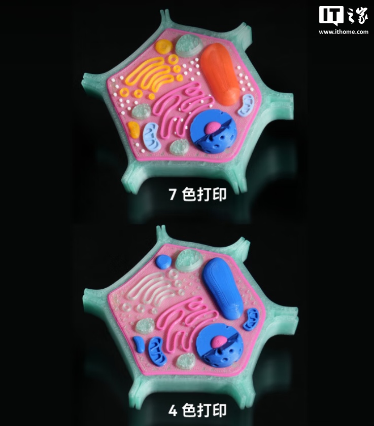 拓竹 H2C 支持一次打印 7 色成型、刚性零件与柔性关节一体打印、多材料一体成型打印;搭载 Vortek 热端切换系统,减少废料产生。