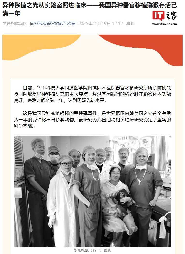 IT之家从同济医院器官捐献与移植官方公众号获悉,2024 年 11 月,团队首次在国内实现了基因编辑猪肾移植至猕猴体内成功存活超过半年;2025 年 10 月 28 日,(同一批的另一只)猪肾存活时间突破一年,各项生理指标稳定,成为除美国之外首个存活达一年的异种移植灵长类动物案例。