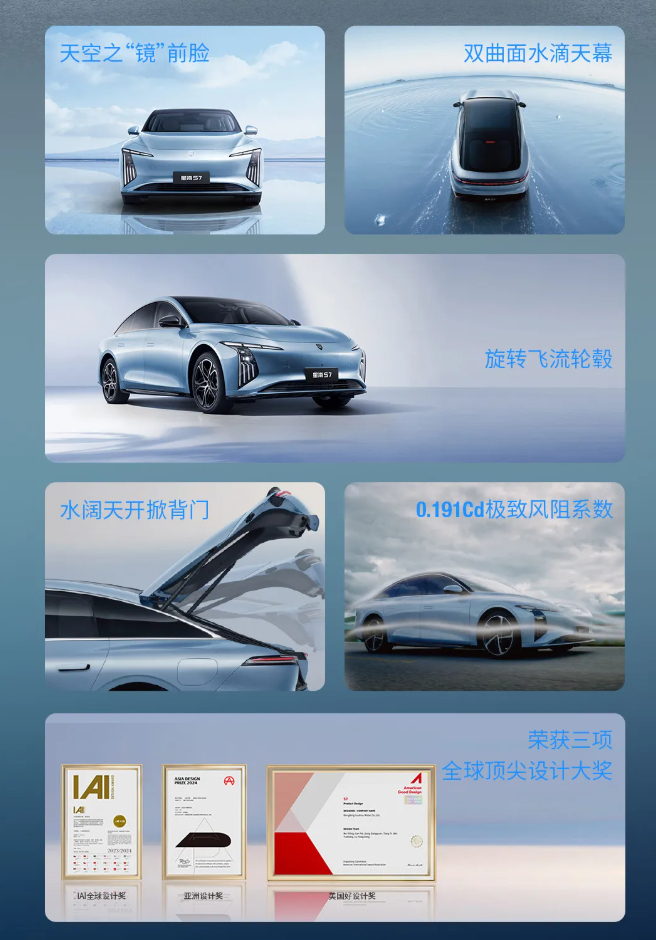 这款汽车的长宽高分别是 4935*1915*1510mm,轴距 2915mm,提供 6 种车身颜色,分别为云霞紫、烟雨蓝、赤云红、玄墨黑、云水白、碧波绿。