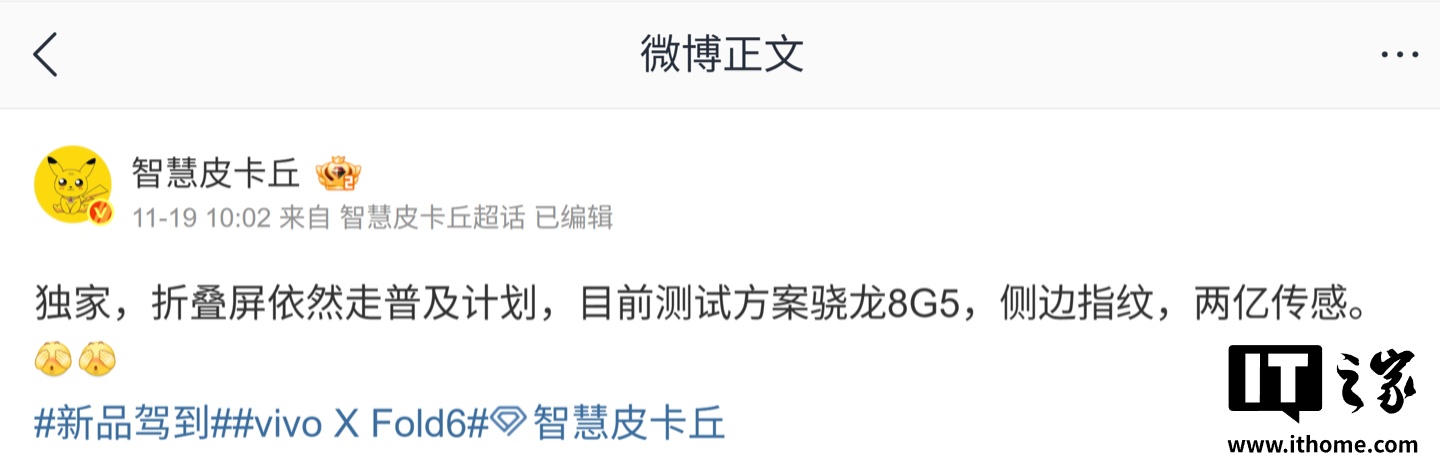 IT之家 11 月 20 日消息,博主 @智慧皮卡丘 昨天在微博透露,vivo X Fold6 折叠屏手机依然走普及路线。