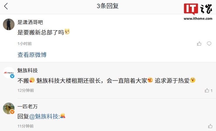 值得一提的是,有用户在该微博评论区留言询问魅族是否要搬去新总部?魅族科技官方表示:“不搬,魅族科技大楼租期还很长,会一直陪着大家,追求源于热爱。”星纪魅族集团中国区 CMO 万志强随后也留言了“拥抱”的表情。