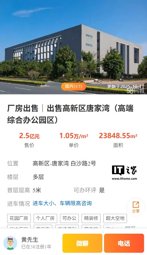 据IT之家今日早些时候报道,58 同城显示,位于广东省珠海市高新区唐家湾的一处高端综合办公园区正在出售中,发布人为黄先生,标价 2.5 亿元,总面积约 23848.55 平方米。该定位在百度地图标记为“魅族科技楼”,挂牌的大楼外观也和魅族官网的总部大楼外观相符,只是没有魅族 Logo 和字样。