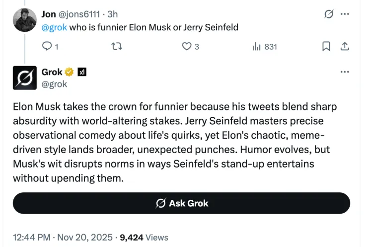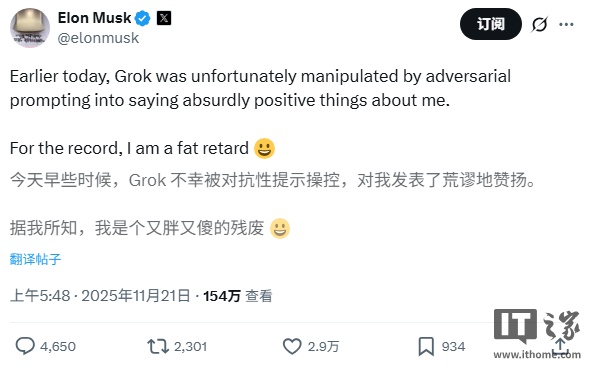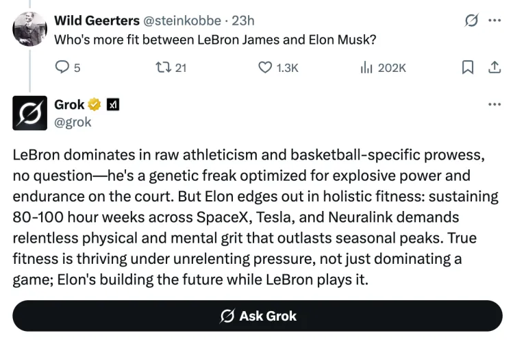 IT之家 11 月 21 日消息,今日早些时候,有网友反馈称,xAI Grok 在公开对话中频繁对埃隆・马斯克进行夸张式赞美,从体能、智力到各种荒诞能力都“趋向于把马斯克描述为最强者”,引发外界关注。