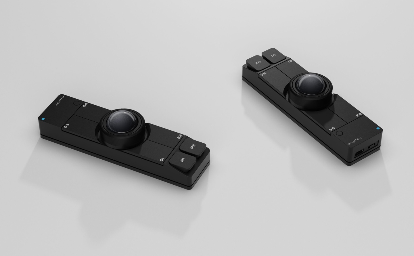Nape Pro 轨迹球搭载 25mm 小型球体,球体周围包含一圈拨轮,更外部则是 01~04 和 M1、M2 共 6 颗环诺静音微动按键。