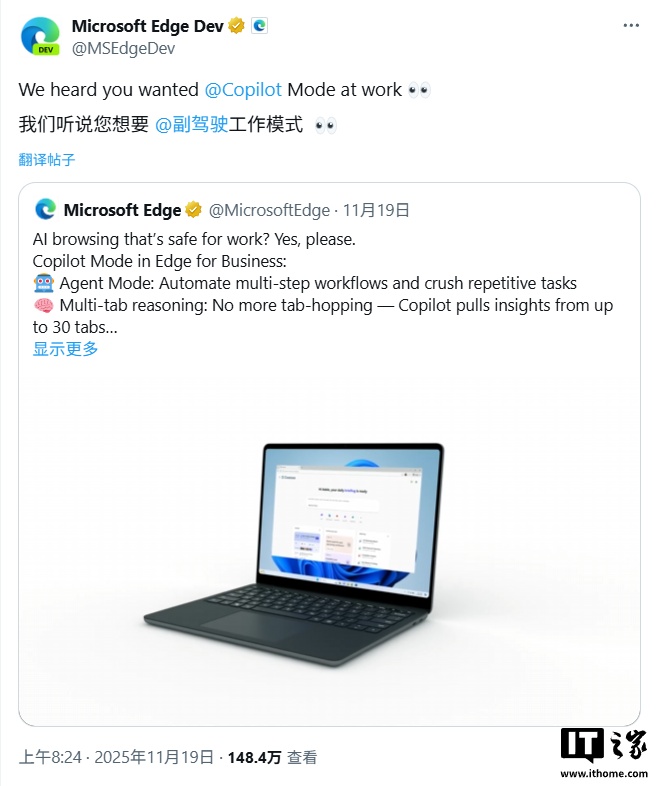 微软试图通过社交媒体向更广泛的受众推广 Copilot 时,再次遭遇了用户的猛烈批评。微软 Edge 浏览器开发者官方账号在 X 平台上发布了一则关于“Edge 企业版 Copilot 模式”的推广内容,结果评论区迅速被负面声音淹没。该帖子吸引了近千条回复,其中绝大多数都在批评微软的这一决策,用户的抵触情绪显而易见。