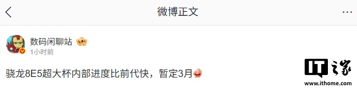 IT之家 11 月 21 日消息,博主 @数码闲聊站 今日爆料,某厂骁龙 8E5(第五代骁龙 8 至尊版)超大杯内部进度比前代快,暂定 3 月。结合该博主此前的爆料习惯,预计为 vivo X300 Ultra 手机。