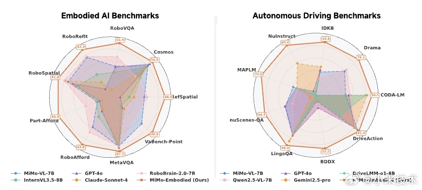 MiMo-Embodied 宣称是业界首个成功打通自动驾驶与具身智能的跨域具身基座模型,它实现了两大领域任务的统一建模,标志着通用具身智能研究从“垂直领域专用”向“跨域能力协同”迈出关键一步。