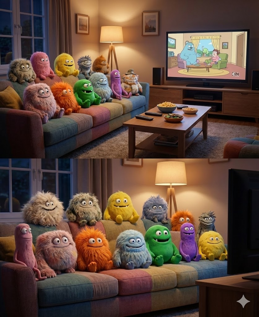 先不说别的,整个氛围感确实很符合要求,玩偶们排排坐在沙发上看动画。而且落地灯照出的光影和玩偶在窗户里的背影这些细节都考虑到了,整体生成效果相当不错。