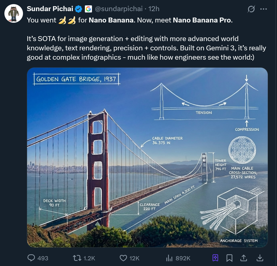 它又名 Gemini 3 Pro Image,整合了 Gemini 3 Pro 的多模态理解能力以及谷歌搜索的知识库,能理解现实语义与物理逻辑。