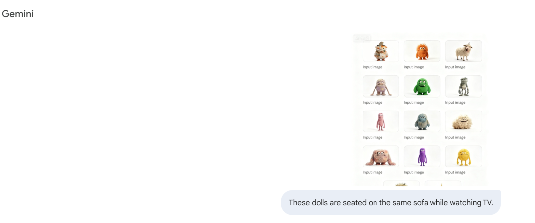 再试试图像融合呢~ 为了节省时间,我们直接把难度拉满 —— 让 14 只娃娃坐在一起看电视。