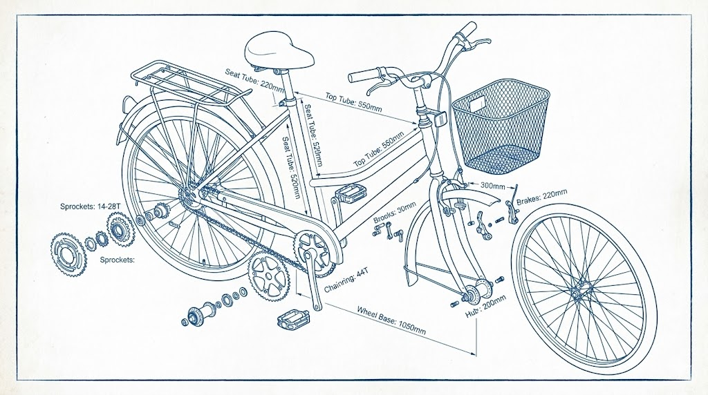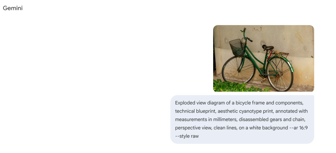 提示词:Exploded view diagram of a bicycle frame and components, technical blueprint, aesthetic cyanotype print, annotated with measurements in millimeters, disassembled gears and chain, perspective view, clean lines, on a white background —ar 16:9 —style raw