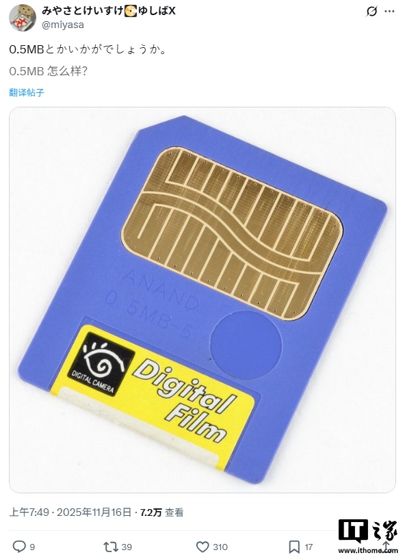 该活动由 @X68PRO-HD 于 11 月 15 日发起,参赛者竞逐各自能够找到的最小容量存储卡。最终胜出的,是一张仅有 0.5MB 容量的 SmartMedia 卡。