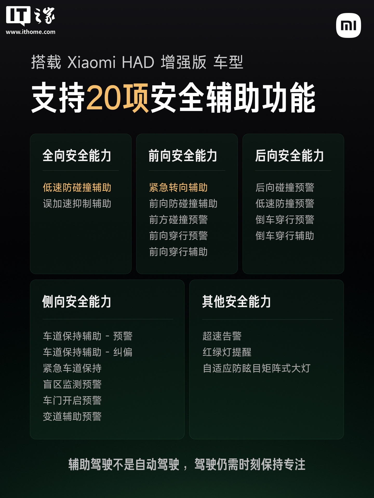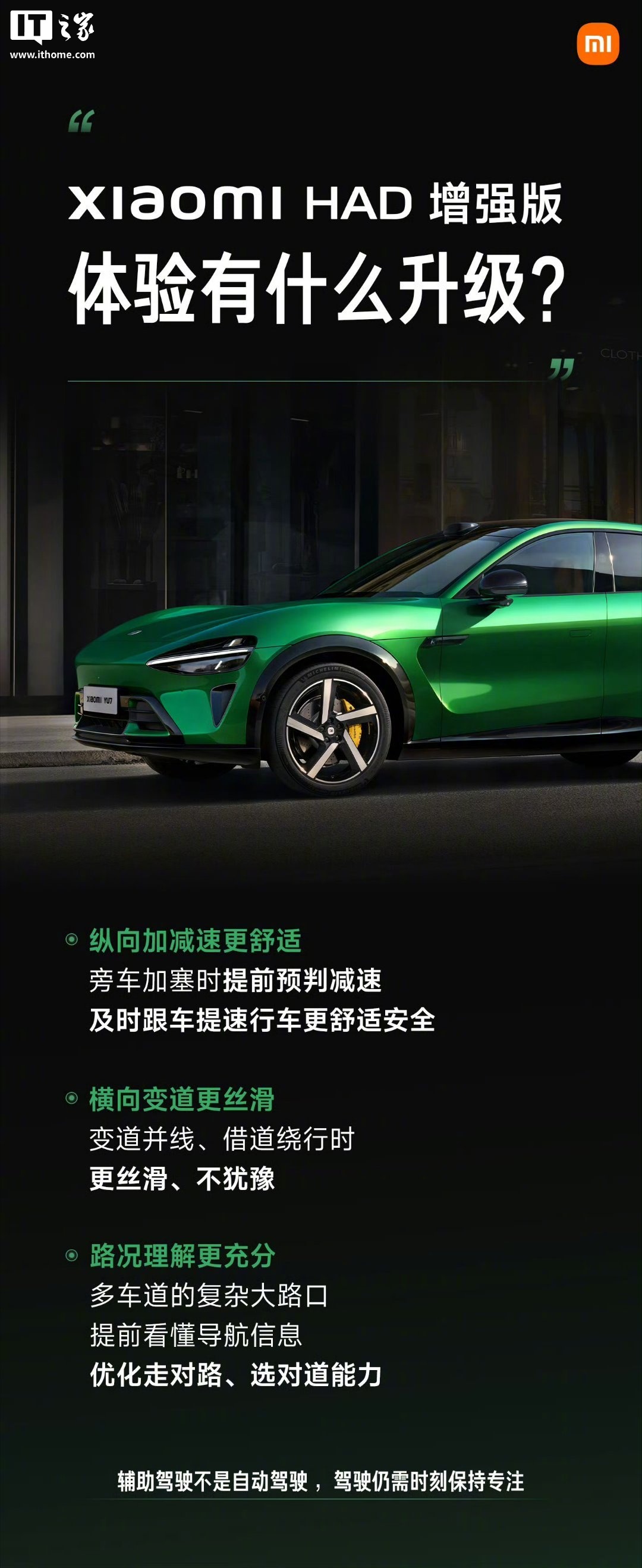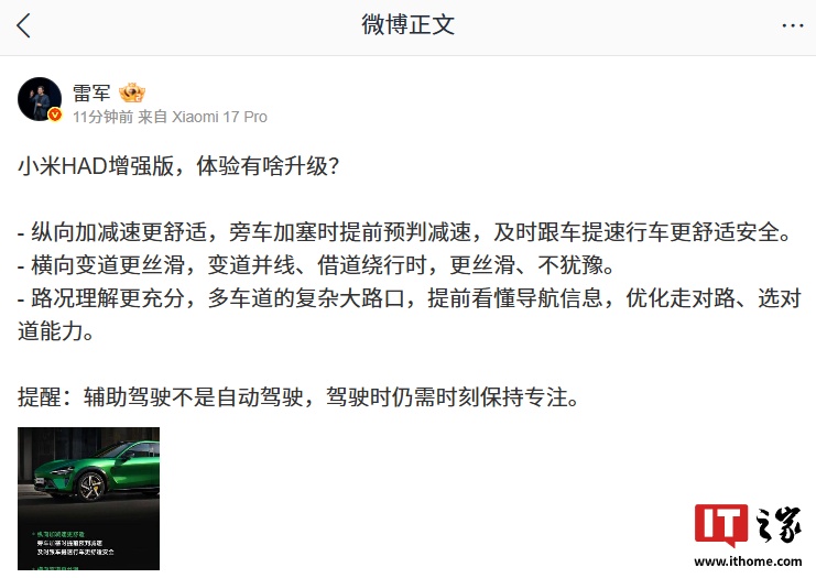 IT之家 11 月 23 日消息,小米创办人、董事长兼 CEO 雷军今日发文,总结了小米端到端辅助驾驶 HAD 增强版的升级点。
