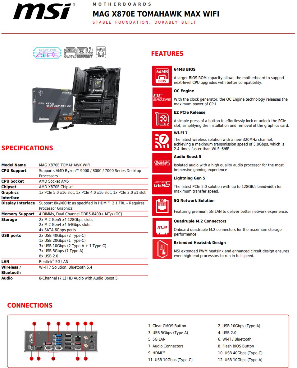 X870E 型号同样升级至 64 MB BIOS,并保留原有的 PCIe x16、M.2、5G 网口、内存支持等完整配置。设计上与非 MAX 版本基本一致,同样加入 OC Engine 与 EZ DIY 等功能。