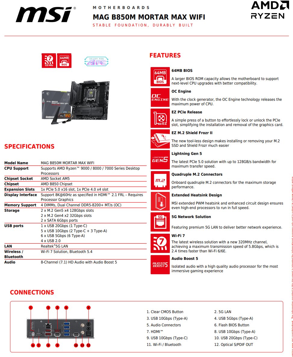 其中,MAG B850M 迫击炮 Max WiFi 预计会是其中定价最低的型号。