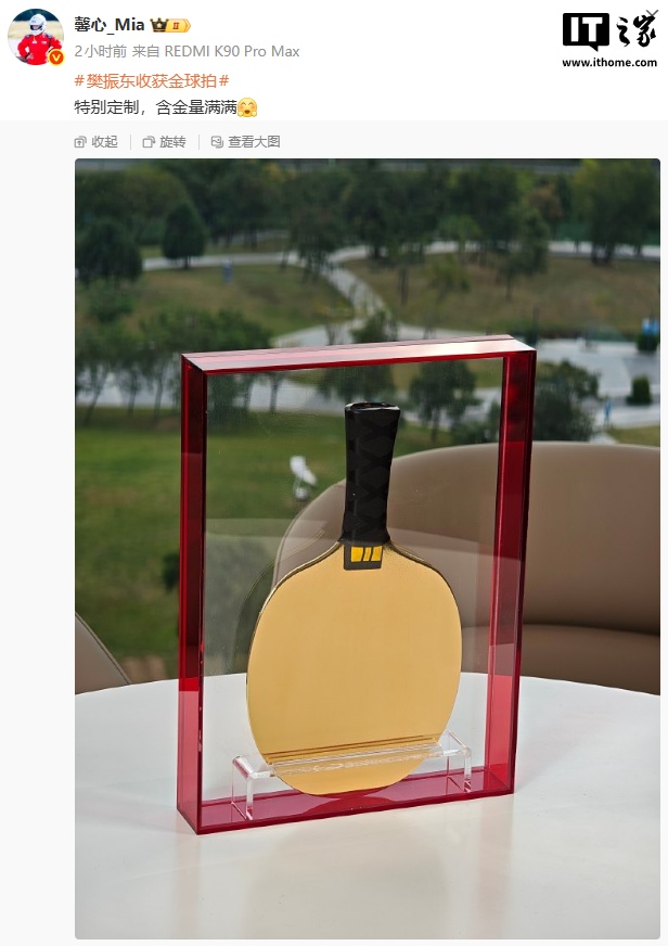IT之家 11 月 24 日消息,今日,REDMI 冠军大使樊振东到小米之家深圳小米大厦店当一天店长,REDMI 产品经理胡馨心透露,樊振东收获一副特别定制金球拍,含金量满满。