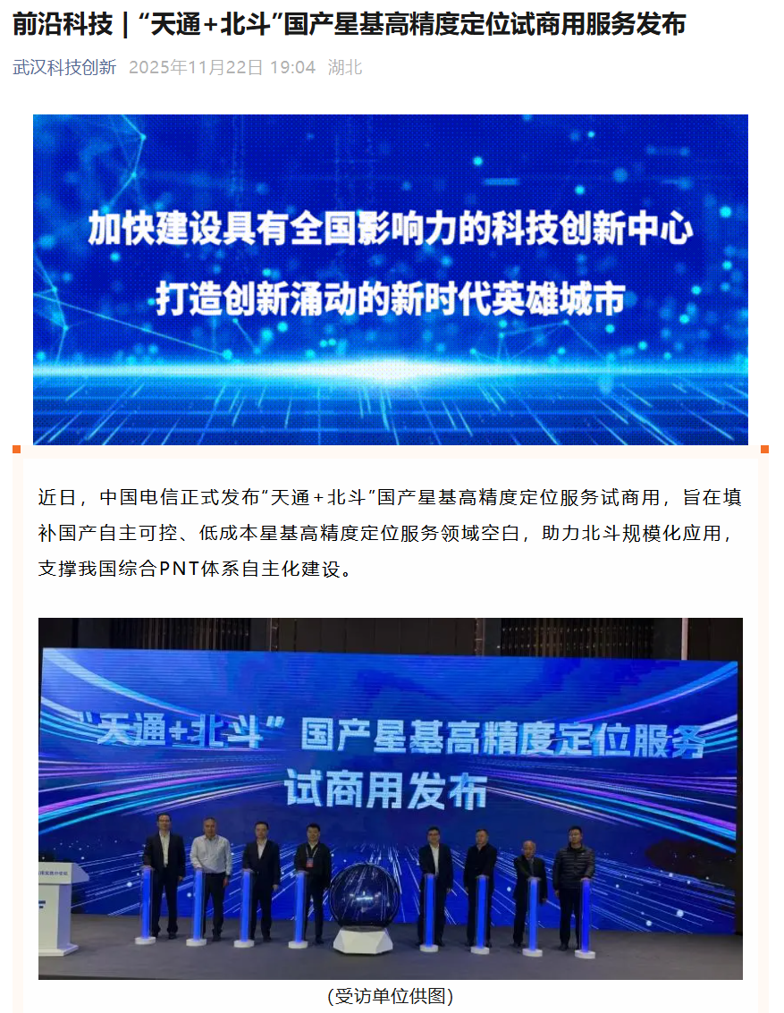 中国电信正式发布“天通 + 北斗”国产星基高精度定位服务试商用。依托“天通一号”卫星移动通信系统的资源优势,中国电信卫星公司与中国科学院空天信息创新研究院联合开展技术攻关,建成我国首套全国产星基导航增强系统,可在天通卫星覆盖范围内,不依赖地面网由天通卫星实时广播增强信息,为陆海空天多场景提供实时动态分钟级收敛、厘米级定位服务。