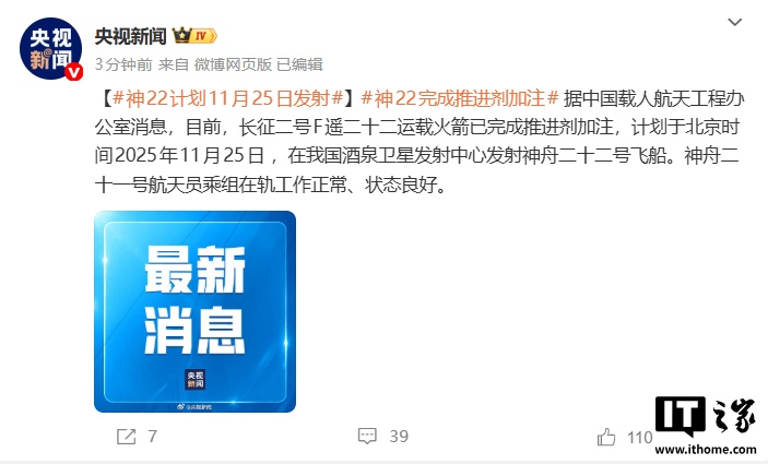 IT之家 11 月 24 日消息,据央视新闻报道,据中国载人航天工程办公室消息,目前,长征二号 F 遥二十二运载火箭已完成推进剂加注,计划于北京时间 2025 年 11 月 25 日,在我国酒泉卫星发射中心发射神舟二十二号飞船。神舟二十一号航天员乘组在轨工作正常、状态良好。