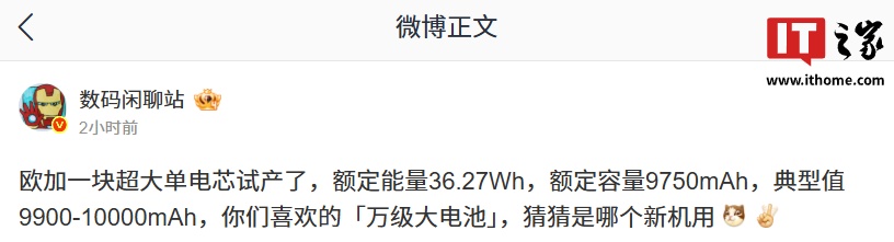 IT之家 11 月 25 日消息,博主 @数码闲聊站 今日发文透露,欧加(OPPO、一加、realme)超大单电芯试产,额定能量 36.27Wh、额定容量 9750mAh、典型值 9900-10000mAh,属于「万级大电池」。