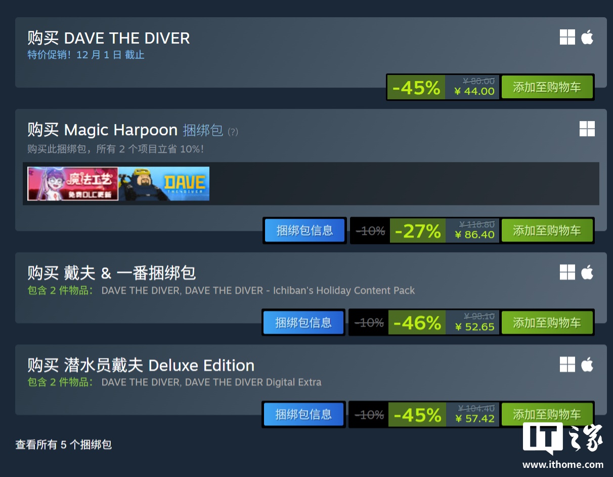 IT之家 11 月 25 日消息,独立游戏《潜水员戴夫》现已开启新一轮史低促销,目前在 Steam 国区售价 44 元,相比原价 80 元打了 5.5 折。