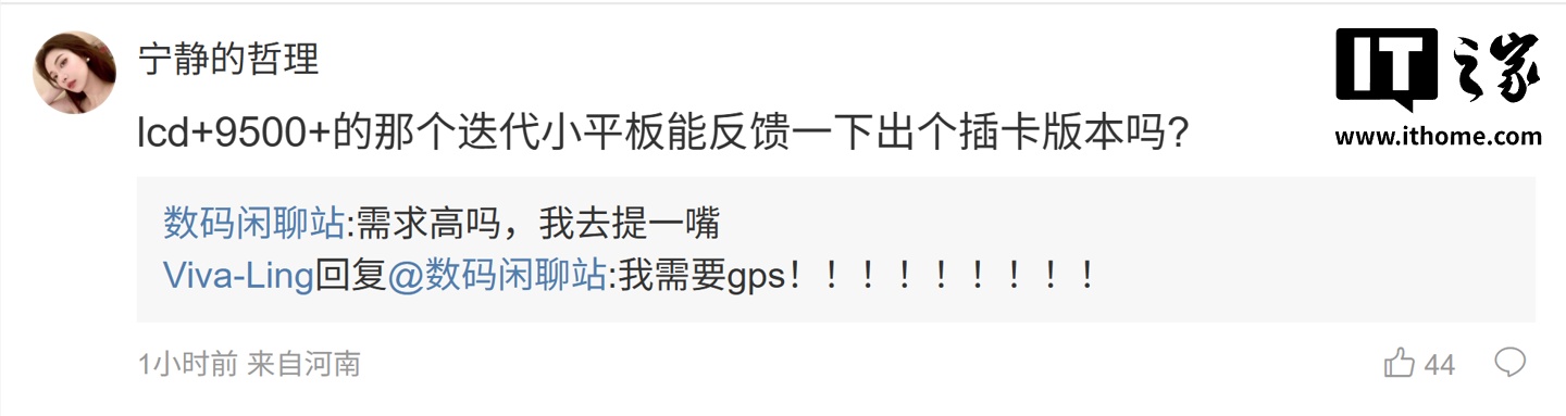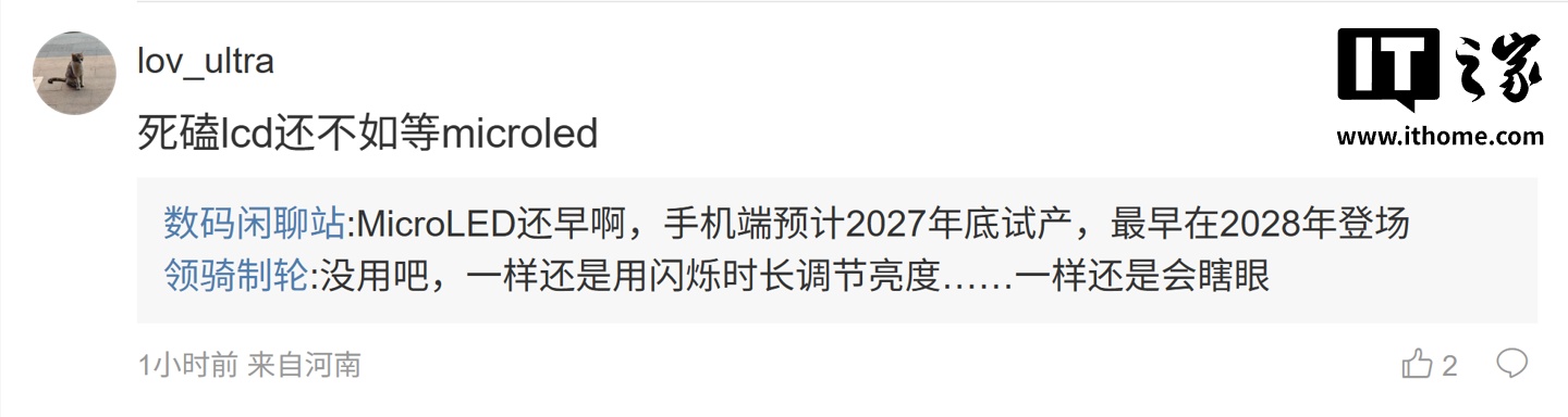 后续有用户在评论区询问:“lcd+9500+ 的那个迭代小平板能反馈一下出个插卡版本吗?”,博主回复道:“需求高吗,我去提一嘴”;另一名用户则表示:“死磕 lcd 还不如等 microled”,博主则回复道:“MicroLED 还早啊,手机端预计 2027 年底试产,最早在 2028 年登场”。