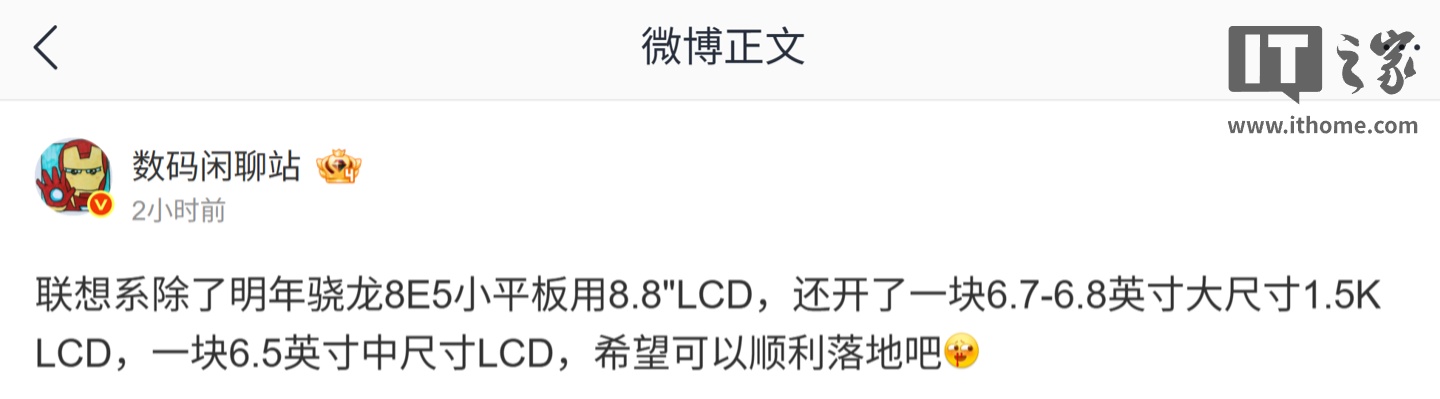 博主表示,联想目前新开了一块 6.7-6.8 英寸大尺寸 1.5K LCD 屏幕、一块 6.5 英寸中尺寸 LCD 屏,希望可以顺利落地。