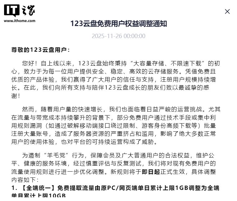 IT之家 11 月 26 日消息,123 云盘今日发布免费用户权益调整通知,表示随着用户量的快速增长,平台面临着日益严峻的运营挑战。