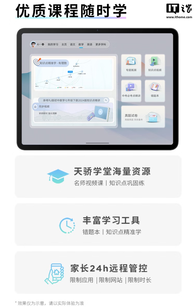 据介绍,联想来酷平板 12.7 配备立体声四扬声器,其屏幕支持 90Hz 高刷(分辨率 2176×1600),并提供护眼模式、阅读模式、深色模式等护眼功能。该平板内置天骄学堂教育资源,支持家长 24h 远程管控(限制应用、限制网站、限制时长)。