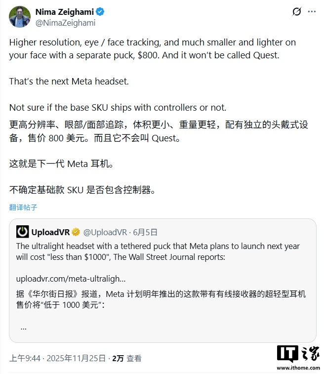 IT之家 11 月 26 日消息,消息源 Nima Zeighami 昨日(11 月 25 日)在 X 平台发布推文,爆料称 Meta 正在开发下一代 XR 头显,但可能不再命名为 Quest 4。