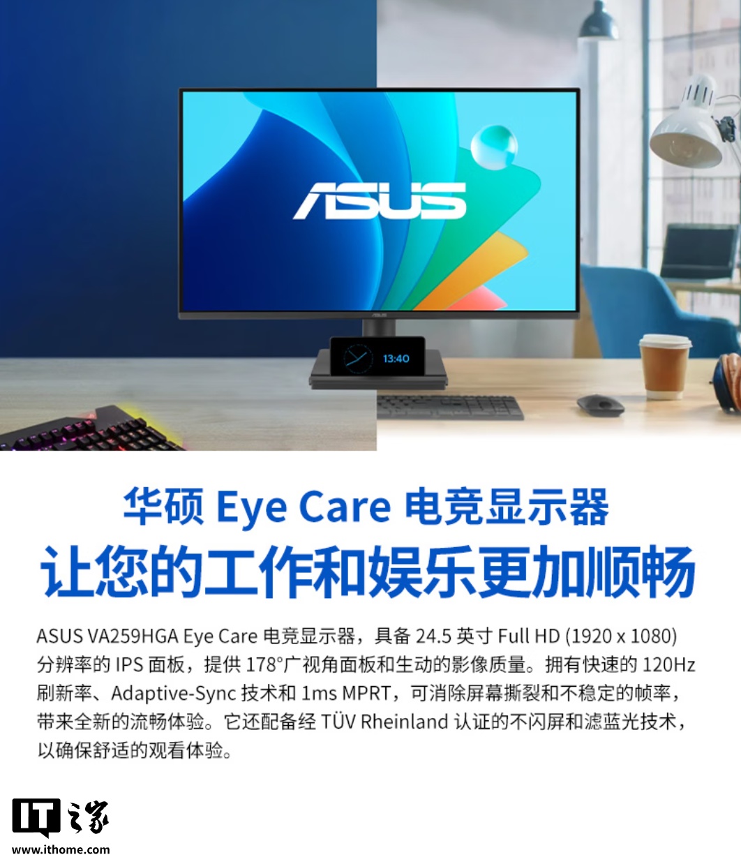 IT之家 11 月 26 日消息,华硕现已推出 VA259HGA 显示器,主打办公等场景,内置 24.5 英寸 1080P(IT之家注:1920*1080) IPS 面板,支持壁挂安装,售价 610 元。